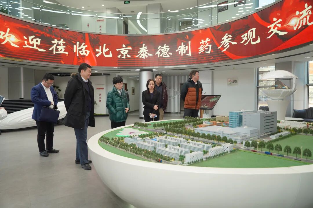 刘沛会长一行参观了泰德总部、研发中心、党建室、企业文化长廊,了解企业产品布局及研发管线等情况,并同中国生物制药有限公司副总裁靳松、北京泰德制药股份有限公司总裁孙宇航及其团队进行座谈交流。