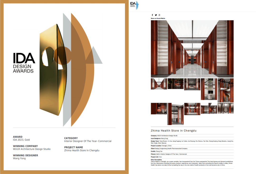 近日,2023美国IDA(International Design Awards)国际设计大奖正式公布。同仁堂知嘛健康成都旗舰店从全球多个国家的参赛作品中脱颖而出,荣获年度室内设计-商业类别金奖。