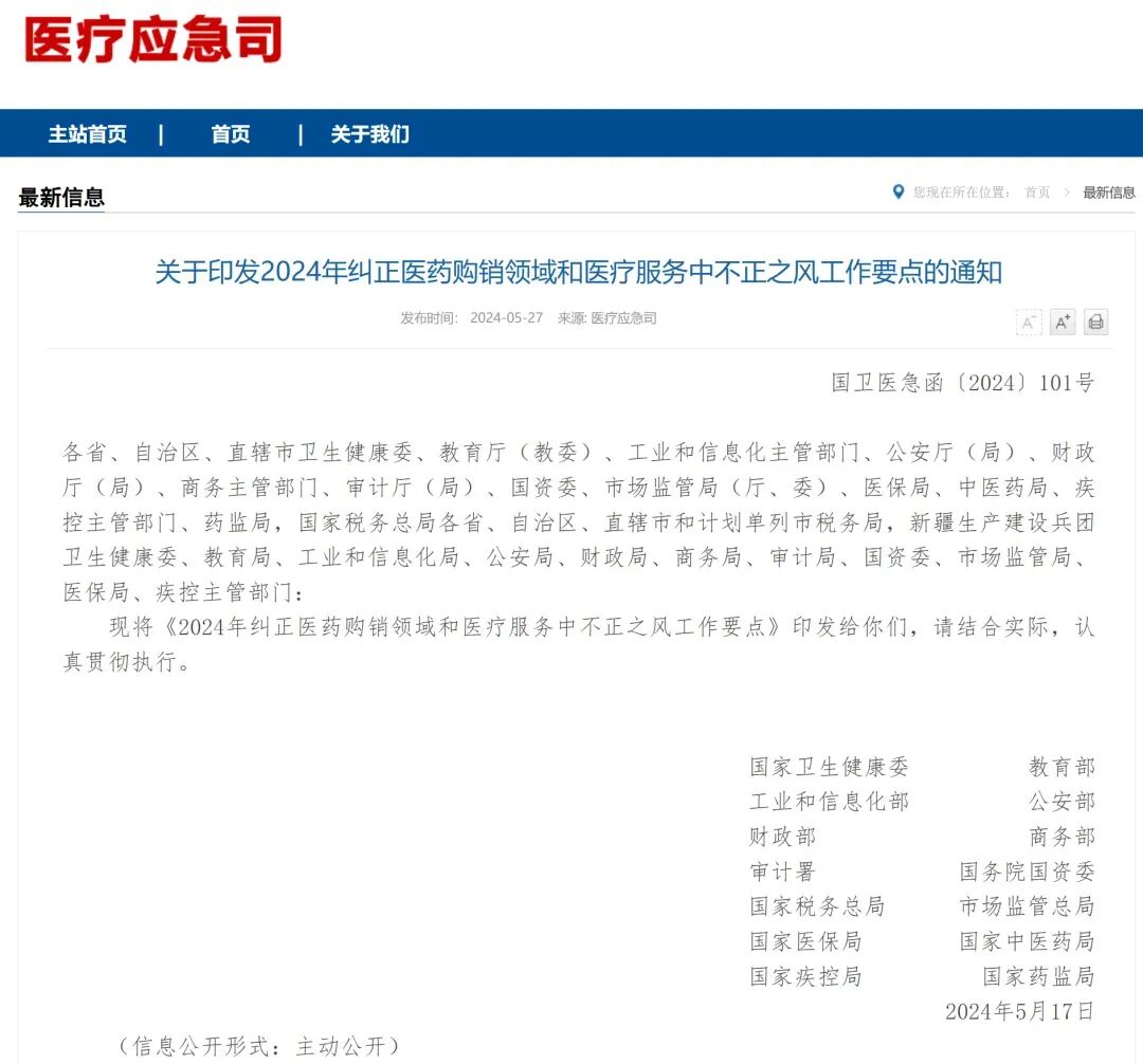 为切实做好2024年纠正医药购销领域和医疗服务中不正之风工作,国家卫生健康委、教育部、工业和信息化部、公安部、财政部、商务部、审计署、国务院国资委、税务总局、市场监管总局、国家医保局、国家中医药局、国家疾控局、国家药监局等全国纠正医药购销领域和医疗服务中不正之风部际联席工作机制(下称“纠风部际机制”)14部委联合制定印发了《关于印发2024年纠正医药购销领域和医疗服务中不正之风工作要点的通知》(国卫医急函〔2024〕101号,下称“《通知》”)。
