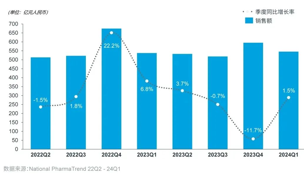 2024年第一季度,全国地级市市辖区零售药店市场销售规模达到了545.5亿元人民币,相较于去年前三个月,规模同比小幅增长了1.5%。