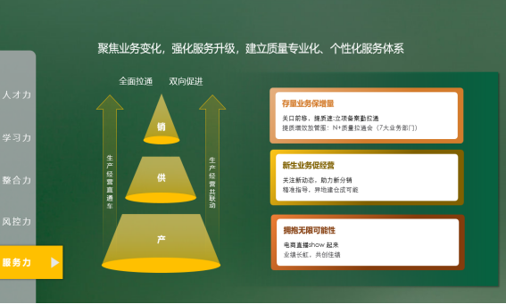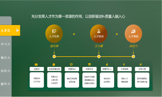 企业壮大离不开“人、财、物”三大支柱。人才建设、培养是企业战略落地、文化传承和品牌持久的核心,“人才力”与“学习力”为其关键驱动因素,因此,人才培养与建设至关重要;其次,为有效推动企业效益提升,需深化各部门的协同合作,以组织整体利益为导向,构建工作联席机制。因此“整合力”建设势在必行;为提高企业抗风险能力,企业要持续保持高度的质量警觉性,加强风险预防,发挥前哨作用,故“风控力”是为企业保驾护航的必须要素;质量工作不仅局限于监督与管理,更重要的是为各业务部门提供坚实的质量支持。质量工作需秉持目标导向,广泛开展业务沟通,构建协同机制,强化联动效应,使质量工作更具主动性和实效性,为业务条线快速发展蓄力,因此精进“服务力”是N+质量赋能企业全产业链价值增长的核心关键。