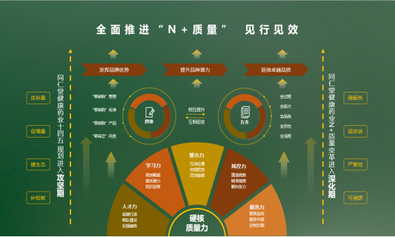 为全面落实同仁堂集团“十四五”规划的各项要求,大力推进全面质量管理,更好的服务各项业务的发展。同仁堂健康药业公司创新性提出360度全方位的“N+质量”管理模式,使质量无处不在、各级质量管理全面提升,质量效能最大化。“N”是指企业现在和未来的所有业务,“N+质量”就是要将质量更好的融入业务中,成为业务的合伙人,建立战略合作伙伴。为明确实现路径,同仁堂健康药业公司提出了“1224”的战略沙盘。即一个目标、两个驱动、双向贯通和四条通道。“1”个目标指基于客户价值导向的质量运营目标。“两个”驱动指“零缺陷”和“一个基础,两个目标”双质量战略驱动。“双项贯通”指横纵两条链的全部拉通,纵向是从客户需求到客户满意供、产、销、服自上而下的拉通,横向是前端销售、后端供应通过过程管控和追溯体系实现两套质量能力双对齐。四条通道是以“N+质量”为核心,并联起实现形式、角色定位、创新思路和提升工程而打造的落地路径。