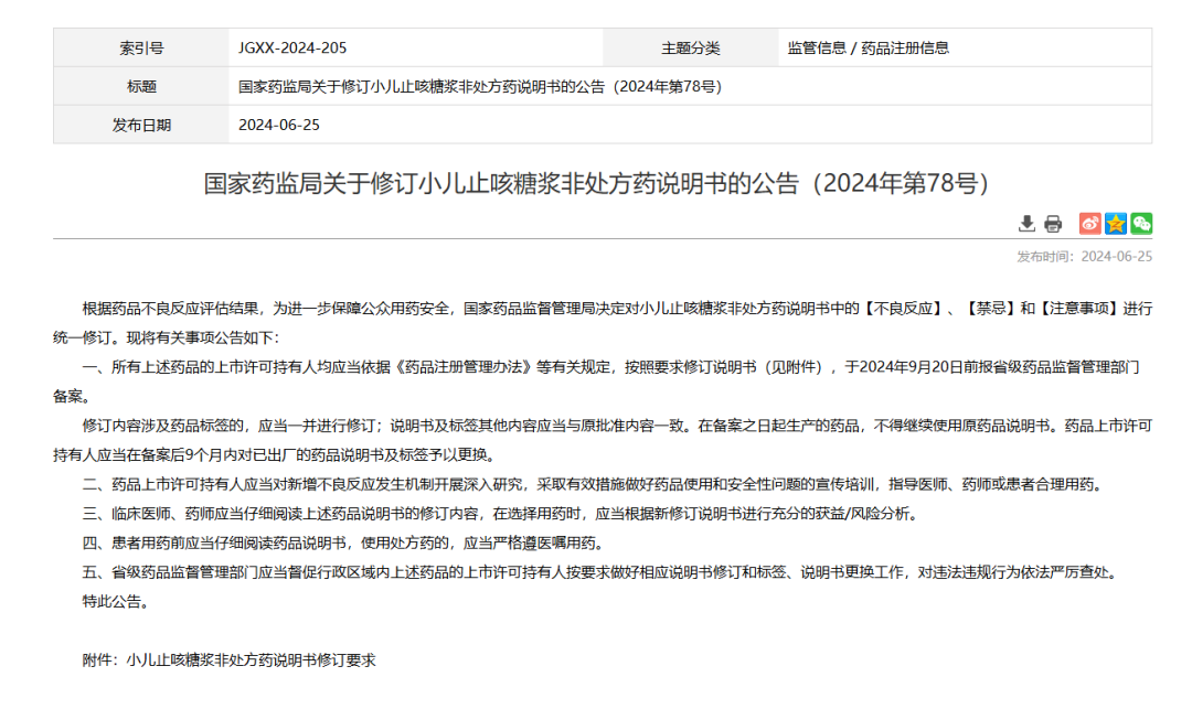 根据药品不良反应评估结果,为进一步保障公众用药安全,国家药品监督管理局决定对小儿止咳糖浆非处方药说明书中的【不良反应】、【禁忌】和【注意事项】进行统一修订。现将有关事项公告如下: