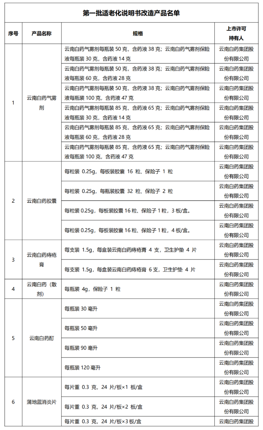 2024年6月,云南白药集团申请的第一批适老化改造产品,云南白药气雾剂、云南白药、云南白药胶囊、云南白药酊、云南白药痔疮膏等16个品种共涉及69个品规均已通过说明书适老化备案获批,近期即将面市。同时,云南白药集团向国家药监局、省药监局提请了集团第二批适老化改造产品名单,下一步公司将加大加快该批试点产品的备案工作,同时积极响应国家号召加速推进公司其余产品的适老化,切实保障老年人、残疾人等特定群体用药安全。让“适老化”离老年消费者更近一点,让药品说明书更“智慧”。