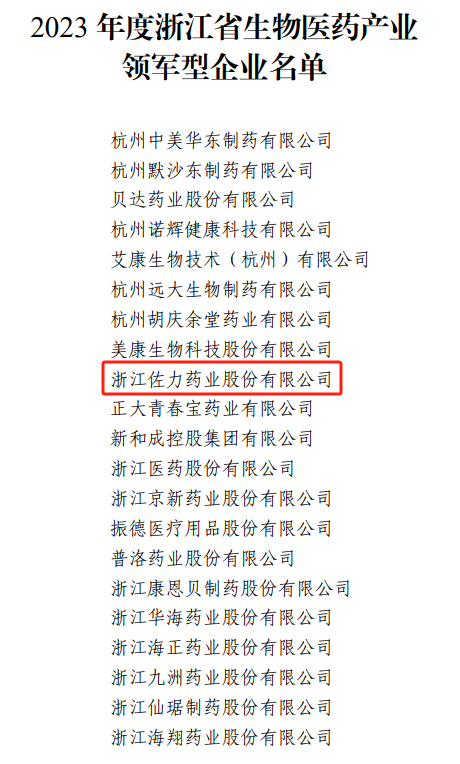 2024年6月27日,浙江省经济和信息化厅发布了《2023年度浙江省生物医药产业重点企业名单(领军型和高成长型)》,浙江佐力药业股份有限公司(以下简称“佐力药业”)凭借其在生物医药领域的卓越表现和创新能力,荣获“浙江省生物医药产业领军型企业”称号。