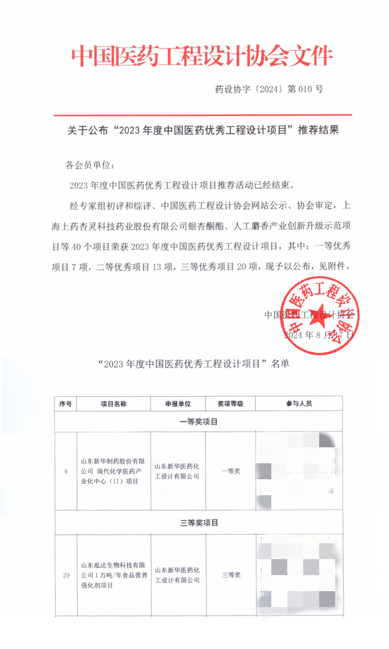 8月17日,中国医药工程设计协会公布了“2023年度中国医药工程优秀设计项目”评选结果,山东新华设计工程有限公司两个项目榜上有名,其中,《山东新华制药股份公司现代化医药产业化中心II项目》荣获一等奖,《山东泓达生物科技有限公司1万吨/年食品营养强化剂项目》荣获三等奖。