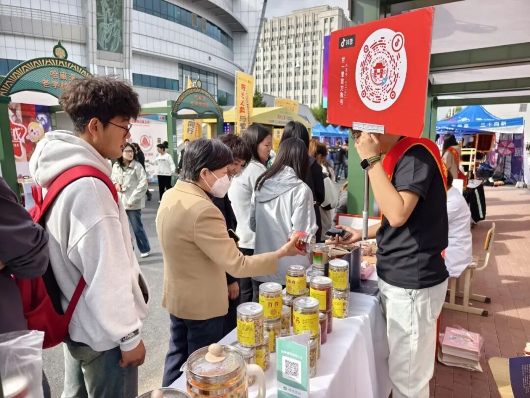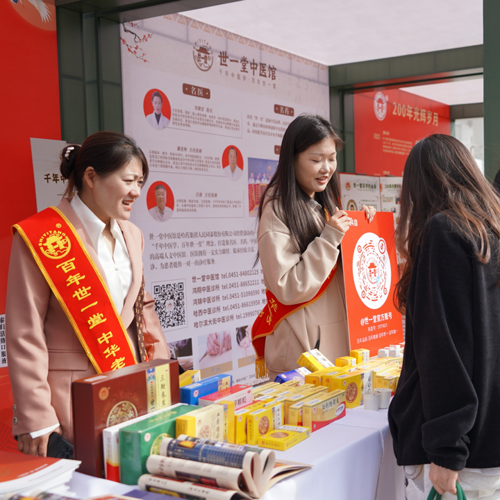 作为龙江经济的重要建设者,哈药下属企业世一堂制药厂、世一堂中医馆应邀参加本次活动。在“老字号文化街”,世一堂与北大荒、完达山、马迭尔、哈肉联等20家知名企业共同参展,通过展销商品、分享品牌故事等,让哈商大师生深刻感受龙江商业文化的深厚底蕴。