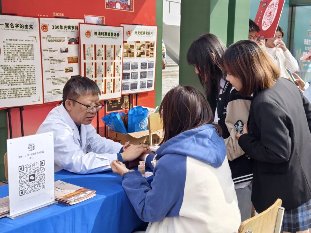 在活动现场,世一堂制药厂、世一堂中医馆除展示重点产品以及药食同源的饮片以外,还延续举办了在首届活动中广受师生好评的中医义诊活动。通过义诊活动,世一堂不仅为师生们的健康提供了切实帮助,同时也向师生们传播了博大精深的中医文化和世一堂的传奇故事。