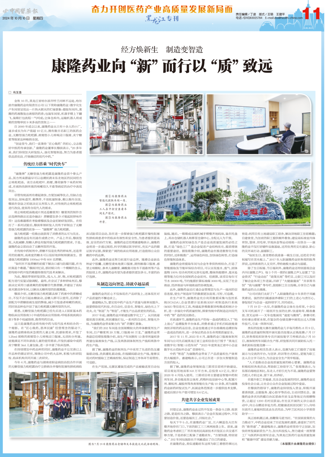企业通过实现关键性、颠覆性的技术突破,开拓出了一条与众不同的康隆产业之路,稳步迈上了量质齐升的的发展“快车道”。10月10日,《中国医药报》——“奋力开创医药产业高质量发展新局面”黑龙江专刊,对康隆药业的创新发展之路进行了报道。