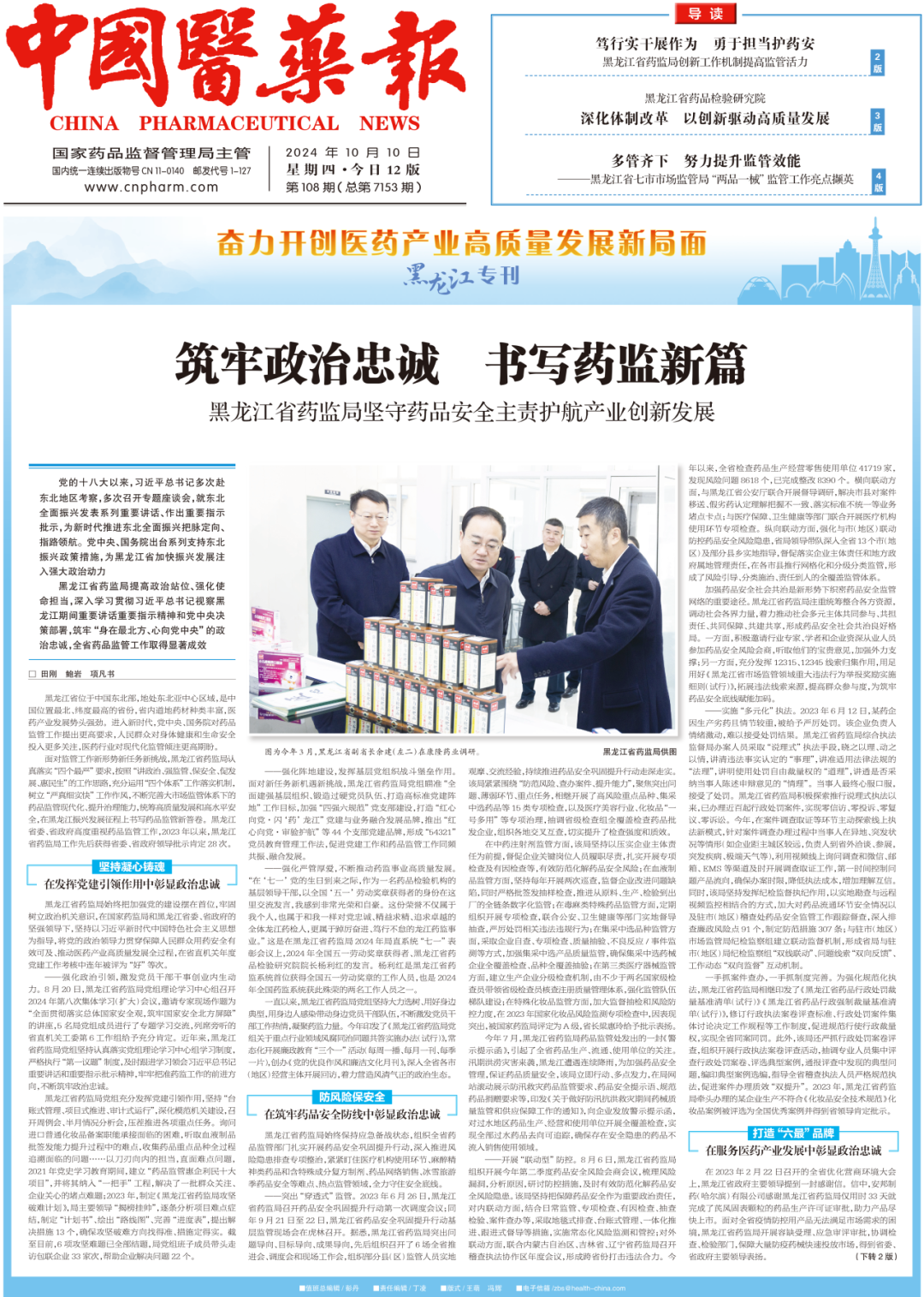 黑龙江省药监局深入学习贯彻习总书记视察黑龙江期间重要讲话重要指示精神和党中央决策部署,在国家药监局和黑龙江省委、省政府的坚强领导下,将党的政治领导力贯穿保障人民群众用药安全有效可及、推动医药产业高质量发展全过程,全省药品监管工作取得显著成效。