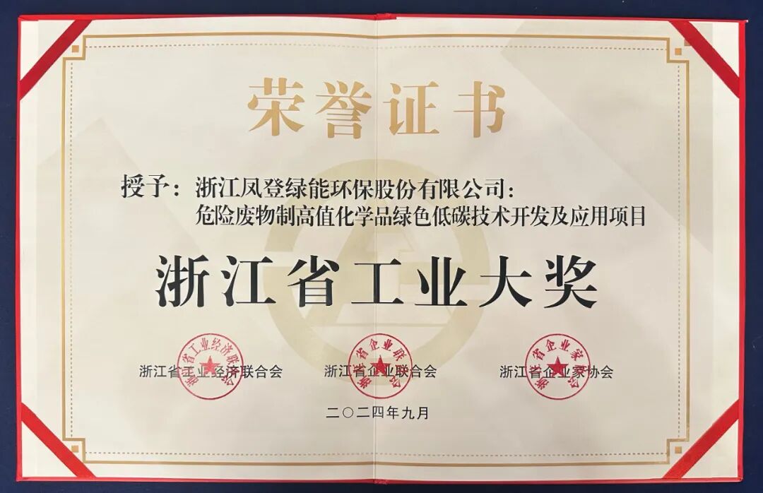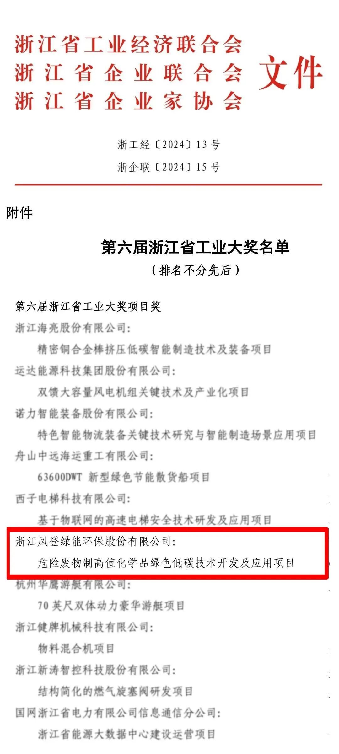 2024年11月13日下午,由浙江省企业联合会、浙江省企业家协会、浙江省工业经济联合会(简称省“三会”)主办的“2024浙江省企业家活动日”在杭州之江饭店举行,大会隆重发布系列重磅榜单,康恩贝集团旗下浙江凤登绿能环保股份有限公司的“危险废物制高值化学品绿色低碳技术开发及应用项目”获第六届浙江省工业大奖。