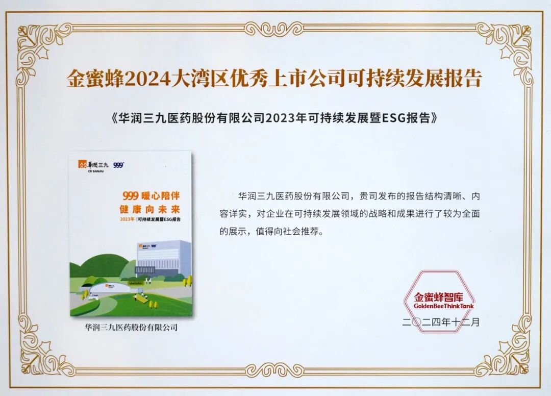 12月12日,由金蜜蜂智库、财经杂志联合主办的第十七届中国可持续信息披露国际研讨会大湾区专场活动在深圳召开。研讨会上,“金蜜蜂2024大湾区优秀企业可持续发展报告榜”正式发布,《华润三九2023年可持续发展暨ESG报告》从697份评估报告中脱颖而出,获评“金蜜蜂2024大湾区优秀上市公司可持续发展报告”。