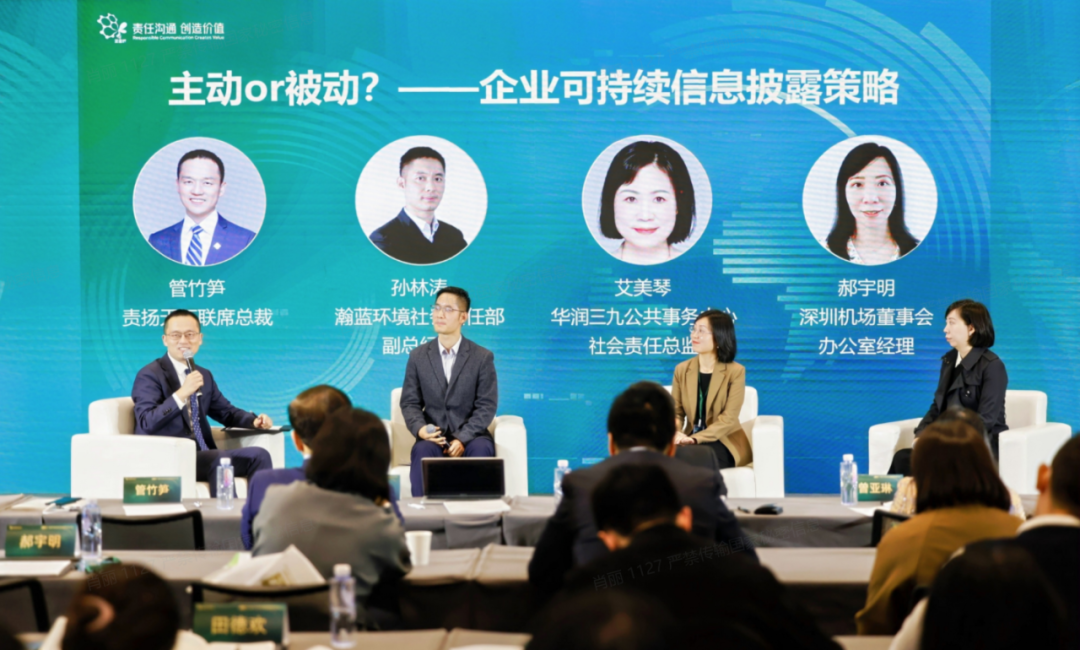 会上,责扬天下联席总裁管竹笋主持的“主动or被动?——企业可持续信息披露策略”专题对话中,华润三九、瀚蓝环境、深圳机场三家企业分享了在可持续信息披露方面的理念、亮点特色、实践经验。华润三九围绕乡村振兴、药品质量安全、提升报告质量等内容进行了互动交流。