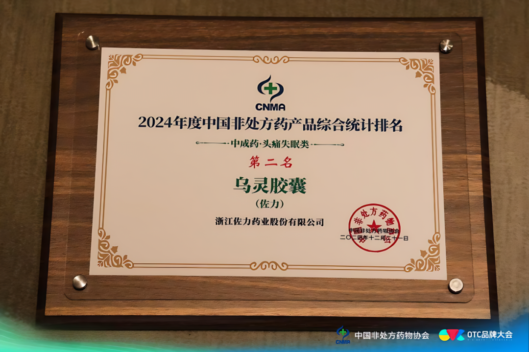 在本次品牌盛会上,佐力药业凭借其明星产品:乌灵胶囊的出众优势,荣耀摘得“2024年度中国非处方药黄金大单品”及“2024年度中国非处方药产品综合统计排名:中成药头痛失眠类第二名”这两项重量级奖项。