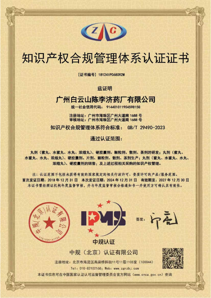 近日,广州白云山陈李济药厂有限公司再度获得中国专利优秀奖,并顺利通过新颁布的国家标准《企业知识产权合规管理体系 要求》(GB/T29490-2023)现场审核认证,获得知识产权合规管理体系认证证书。这是陈李济第四次获得中国专利奖,也是陈李济在知识产权新国标实施首年就完成的体系认证。双喜临门,标志着陈李济专利质量、知识产权管理水平迈上新的台阶。