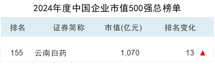 近期,Wind最新发布2024年度“中国上市企业市值500强”榜单,云南白药以1070亿市值位列榜单第155位,排名较上年上升13位。