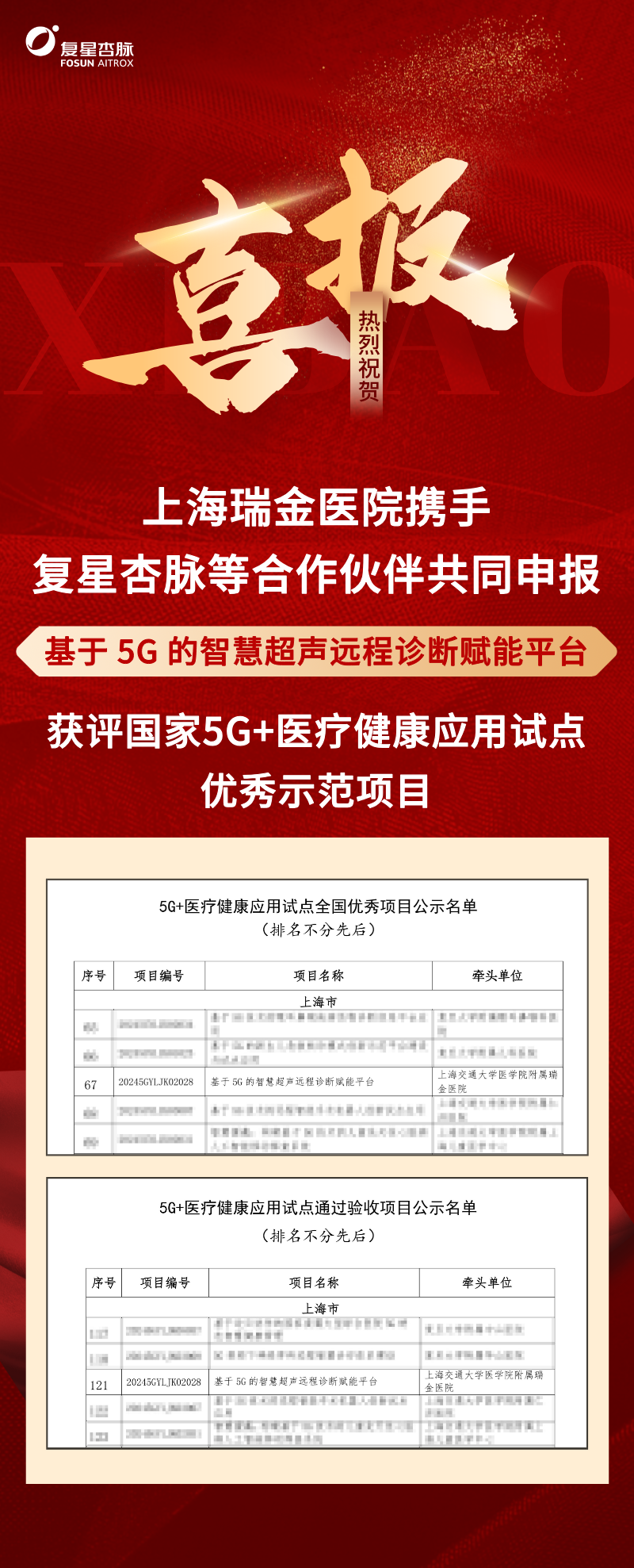 近日,工业和信息化部信息通信发展司与国家卫生健康委员会规划发展与信息化司联合发布了《5G+医疗健康应用试点全国优秀及验收通过项目公示名单》。上海交通大学医学院附属瑞金医院携手复星杏脉等合作伙伴共同申报的“基于5G的智慧超声远程诊断赋能平台”获评国家5G+医疗健康应用试点优秀示范项目。
