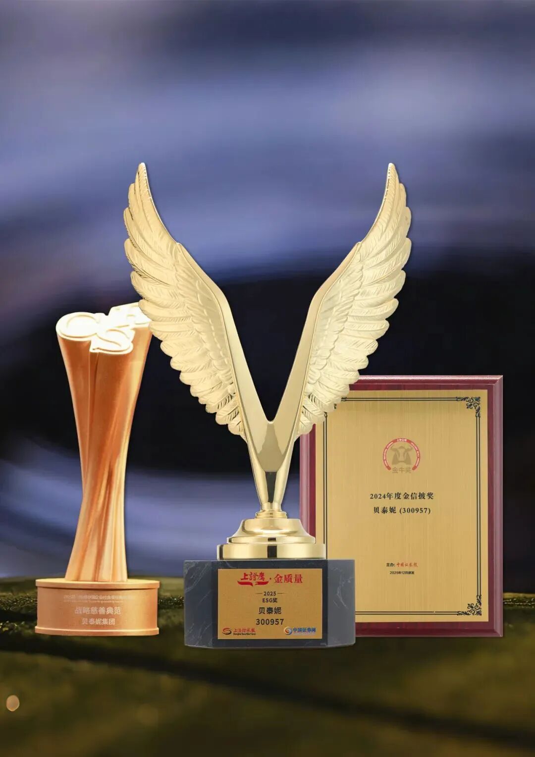 岁杪佳音,共鉴非凡。贝泰妮集团在可持续发展与企业卓越治理领域的深耕,近期再度收获了来自专业媒体与资本市场的高度认可——贝泰妮荣膺中国证券报2024年度上市公司“金信披奖”、2025“上证鹰·金质量”ESG奖及2025第一财经中国企业社会责任“战略慈善典范”。
