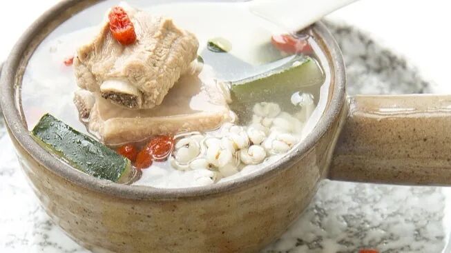 制作方法:将冬瓜去皮去瓤,切片备用。生姜切片,葱切段备用。将薏苡仁洗净,置于炖锅内,适量加水,大火煮开,小火继续煮30分钟。加入冬瓜片、葱、姜,转大火煮开,小火继续煮约15分钟,加少量盐调味即可。
