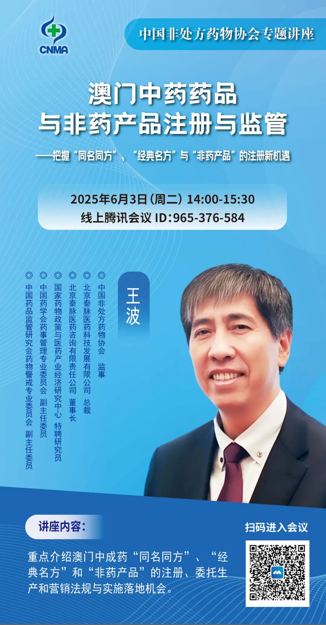 为加强会员服务,丰富服务内容,中国非处方药物协会定于6月3日面向会员企业举办专题讲座,特邀协会监事、行业资深专家王波先生,解读“澳门中药药品与非药产品注册与监管”相关政策。讲座将重点介绍澳门中成药中“同名同方”、“经典名方”及“非药产品”的注册、委托生产及市场准入相关法规与实施机遇,助力会员企业把握政策红利和市场发展契机。